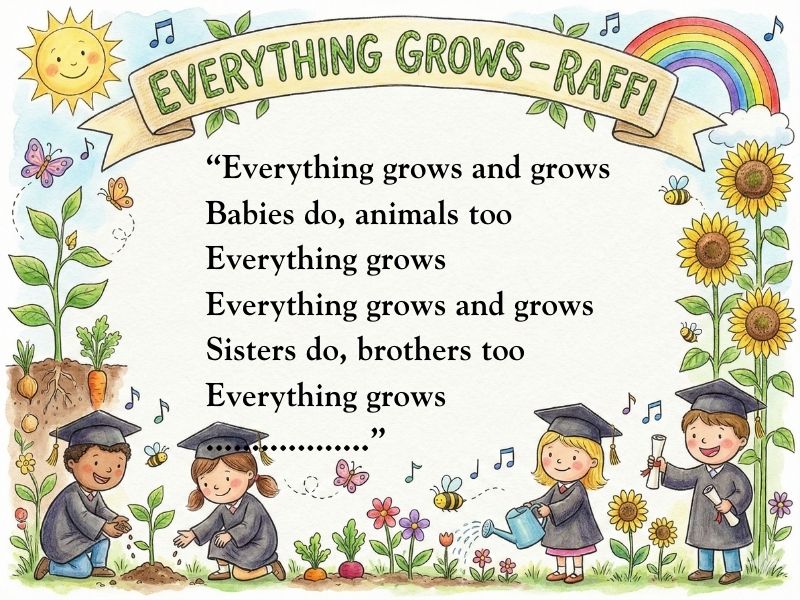 “Everything Grows” is a gentle, repetitive song about how everything in life grows, from babies and animals to grass and trees. It is perfect for preschool graduation because it quietly reminds everyone how much the children have grown, both physically and in their learning, throughout the year.