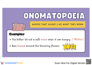 What does the hyperbole "his brain is the size of a pea" mean: He is not very smart. What does the hyperbole "I'm so hungry I could eat a horse" mean: I am so hungry I could eat a horse!. What does the hyperbole "you're walking slower than a snail" mean: You are walking very slowly.. What does the hyperbole "the garden had a million flowers" mean: There were lots of flowers in the garden.. What does the hyperbole "I would move mountains for her" mean: I would do anything for her.. Is this statement hyperbole?"The man is huge": No. Is this statement hyperbole?"They walked down the road to nowhere.": Yes. Is this statement hyperbole?"He was as quick as a lepard.": Yes. Is this statement hyperbole?"My Dad knows everything there is to know about cars!": Yes. What word is the Onomatopoeia in this sentence?There was a loud vroom as he revved the engine: vroom. What word is the Onomatopoeia in this sentence?The girl screamed: “Eek!” as she thought she saw a monster in her closet. : eek. An onomatopoeia is also known as what: A sound word. What word is the Onomatopoeia in this sentence? The pig oinked at the food. : oinked. What word is the Onomatopoeia in this sentence? The bottle popped open. : popped. What word is the Onomatopoeia in this sentence?Boom. "What was that noise?" thought Ms. Paige. : boom. A word that imitates a sound, for example BUZZ and POP:: Onomatopoeia. Read the sentence and choose the onomatopoeia. Mrs. Jacob was sitting by the pond listening to the frogs croak.   : croak. What is a hyperbole: An extreme exaggeration. BANG! is an example of : Onomatopoeia. Our feet squished in the mud: onomatopoeia