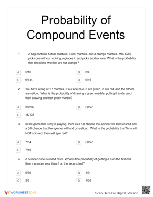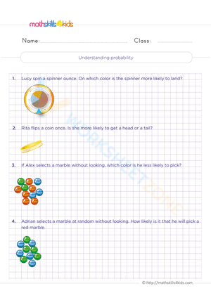 Joe spins the spinner 35 times. How many times should he expect it to not land on yellow: 28 times. The spinner is spun 25 times. What is the best prediction for the number of times it will land on red: 5 times. The spinner is spun 30 times.What is the best prediction for the number of spins that will not land on 3: 25 times. The spinner is spun 60 times.What is the best prediction for the number of spins that will land on 1 or 2: 40 times. Jill rolls a number cube 30 times. How many times should she expect it to land on a 4: 5 times. A number cube is rolled 24 times. What is the best prediction for the number of times it will land on 5: 4 times. A number cube is rolled 100 times. What is the best prediction for the number of times it will land on 7: 0 times. A number cube is rolled 30 times. What is the best prediction for the number of times it will land on a number greater than 4: 10 times. Tarita spins the spinner 40 times. What is the best prediction for the number of times it will land on : 5 times. Tarita spins the spinner 24 times. What is the best prediction for the number of times it will land on or e: 9 times. A coin is tossed 120 times. Which statement best explains what should be expected to happen: The coin should be expected to land on heads roughly 60 times but probably not exactly 60 times.. Tina randomly selected a paper clip, records its color, and returns it to the box.She does this 30 times. How many times should she expect to get a blue paper clip: 5 times. George randomly selected a paper clip, records its color, and returns it to the box.He does this 300 times. How many times should he expect to get a red paper clip: 100 times. A school newspaper randomly surveyed students about which candidate they will choose. The results are in the chart.If the school has 400 students, we should expect Sara to get how many votes in the election: 120 votes