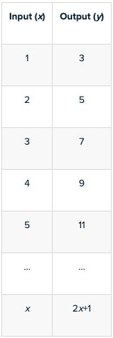"How does our input value change? In other words, what happens to each input value before we receive the output value? Remember that we're looking at a function here." (Each input value, or x-value, is multiplied by 2, with 1 added to the product, resulting, i.e., 2x + 1.)