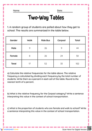 Discover the power of Grade 6 Two Way Tables Worksheets, thoughtfully crafted for teachers, homeschoolers, and parents who want purposeful, skill-building practice. Each worksheet in the collection helps reinforce key concepts, sharpen academic skills, and promote critical thinking in a structured, engaging format. Whether you’re preparing in-class activities, take-home packets, or review sessions, these resources save you planning time while boosting student confidence. Unlike random online printables, Grade 6 Two Way Tables Worksheets offer age-appropriate, standards-aligned, and print-ready materials you can trust. Organized by topic for easy access, it’s the smart way to deliver targeted practice that supports learning at every stage. Make instruction more effective and consistent with Grade 6 Two Way Tables Worksheets—your go-to resource for high-quality worksheets that work in every learning environment.