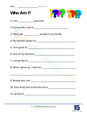 Discover how Who Am I Worksheets Printable can elevate learning outcomes by improving accuracy, retention, and independent thinking. Perfect for elementary teachers, special educators, tutors, and proactive parents, these Who Am I Worksheets Printable include thoughtfully structured worksheets that combine core practice with extension challenges. Each activity aligns directly with lesson goals and academic standards, helping students build mastery while staying engaged. Unlike generic printables, these materials are crafted to support real progress - ideal for classroom use, homework, or targeted intervention. With Who Am I Worksheets Printable, every practice session becomes a purposeful step toward deeper understanding and long-term success. Whether you’re reinforcing key concepts or providing extra support, these worksheets offer a balanced, effective approach that fits seamlessly into any instructional plan.
