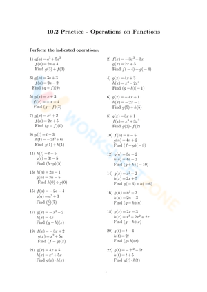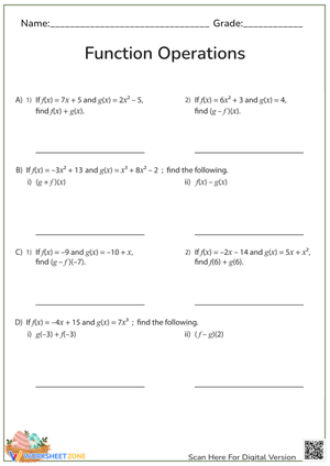 Discover the power of Function Operations Worksheets, thoughtfully crafted for teachers, homeschoolers, and parents who want purposeful, skill-building practice. Each worksheet in the collection helps reinforce key concepts, sharpen academic skills, and promote critical thinking in a structured, engaging format. Whether you’re preparing in-class activities, take-home packets, or review sessions, these resources save you planning time while boosting student confidence. Unlike random online printables, Function Operations Worksheets offer age-appropriate, standards-aligned, and print-ready materials you can trust. Organized by topic for easy access, it’s the smart way to deliver targeted practice that supports learning at every stage. Make instruction more effective and consistent with Function Operations Worksheets—your go-to resource for high-quality worksheets that work in every learning environment.