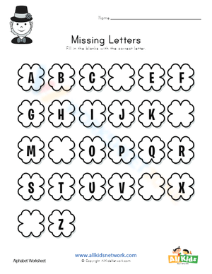 Each four leaf clover has a letter, but some are missing their letter! Kids have to fill in the missing letters in this St. Patrick's Day worksheet.