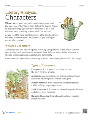 This comprehensive five-page reading comprehension worksheet is tailored for young readers to enhance their skills in character analysis within fictional works. Students will explore different character types, including protagonists, antagonists, static, and dynamic characters. Through a close reading of Beatrix Potter's timeless classic, "The Tale of Peter Rabbit," students will respond to thought-provoking questions about the story's characters. This fourth-grade level worksheet serves as valuable practice for students as they embark on analyzing characters and story structures in the books they read.