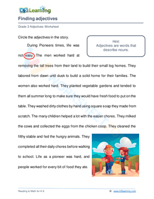 Which word in this sentence is an adjective?The blue bird sang in the morning: blue. Which word is an adjective in this sentence?Sally saw a tall giraffe at the zoo: tall. Name the adjective: thin. What does an adjective describe: noun. What is the adjective in the sentence?The brown dog ran home: brown. Which adjective tells how many: seven. Which adjective describes what kind: wrinkled. Name the adjectives in the sentence.The black and white kitten is mine: black, white. Find the adjectives in the sentence.Molly bought ten red apples at the store: ten, red. Name the adjectives in the sentence.The heavy box was too much for the small man: heavy,small. What are the adjectives in the sentence?The mother lion had three cute cubs: three,cute. What does an adjective do: It describes a noun.