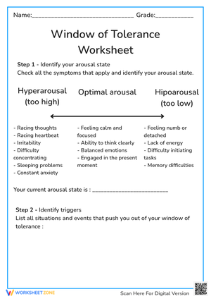 Explore your arousal states with this Window of Tolerance worksheet. Identify triggers & manage emotions. For teens & adults. Get it now!