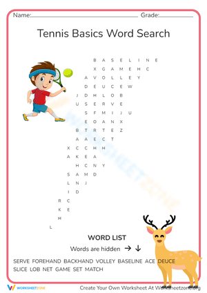 Find tennis words like 'Smash' & 'Serve' in this fun word search! Printable worksheet for grades 2-5. Boost vocabulary and enjoy!