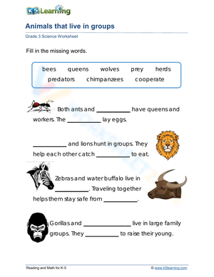 Some animals live in groups; other animals live mostly alone. In this science worksheet, students examine why and how some animals live in groups.