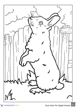 Rabbit coloring page with a bunny standing near a wooden fence. A fun animal printable for kids, perfect for Easter, spring, or classroom use.