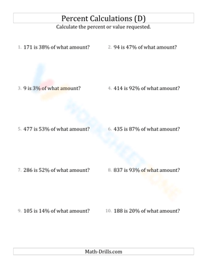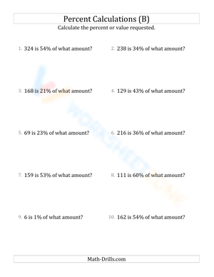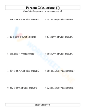 At higher difficulty, the math requires students to calculate the original amount, given the percentage value and rate are known. In other word, this is the backtracking sort of exercises when referred to regular calculating percent or the value of a percent. This type of math may seem daunting to newcomers, but once the students got the grasp of percentage concept, they should be able to overcome these exercises with ease.