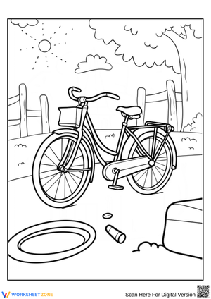 This fun bicycle coloring page features a classic bike in the park with a flat tire—great for lessons on problem-solving and storytelling.