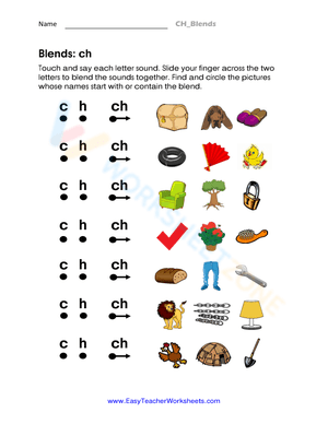 Touch and say each letter sound. Slide your finger across the two letters to blend the sounds together. Find and circle the pictures whose names start with or contain the blend.