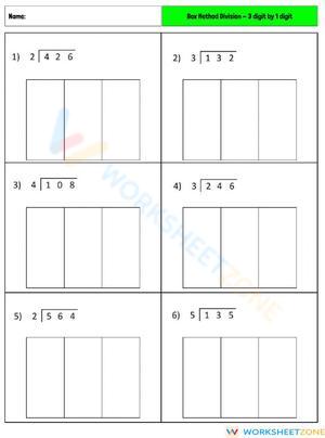 Practice dividing 3-digit numbers by 1-digit numbers with this box method worksheet. Perfect for Grade 4 and 5 students to improve division skills!
