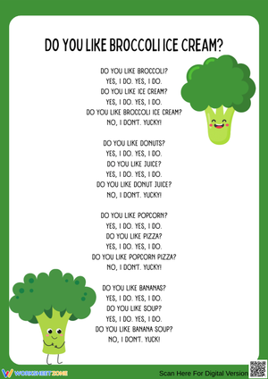 Explore silly food combos with this fun “Do You Like Broccoli Ice Cream?” lyric worksheet—great for laughs, listening skills, and playful reading practice!