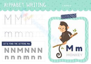 Helps kids learn to write and identify the letter M with tracing and identifying activities. Features a cute monkey illustration for fun.