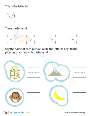 This fun worksheet helps preschoolers and kindergarteners learn to recognize and write the letter M. Kids can trace the letter and identify pictures that begin with M.