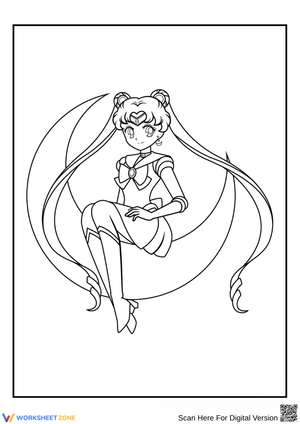 Enjoy a whimsical coloring experience with a cartoon character seated on a crescent moon. The character features large expressive eyes, a joyful smile, and flowing hair styled in pigtails, perfect for sparking creative expression.