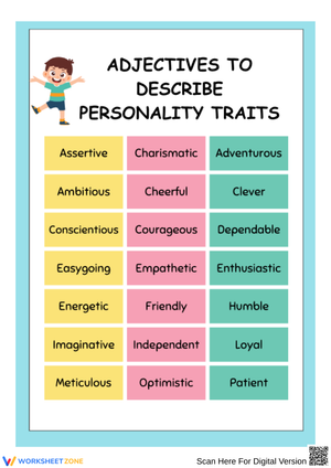 Help students expand their vocabulary with adjectives that describe personality traits. Perfect for enhancing character descriptions in writing.
