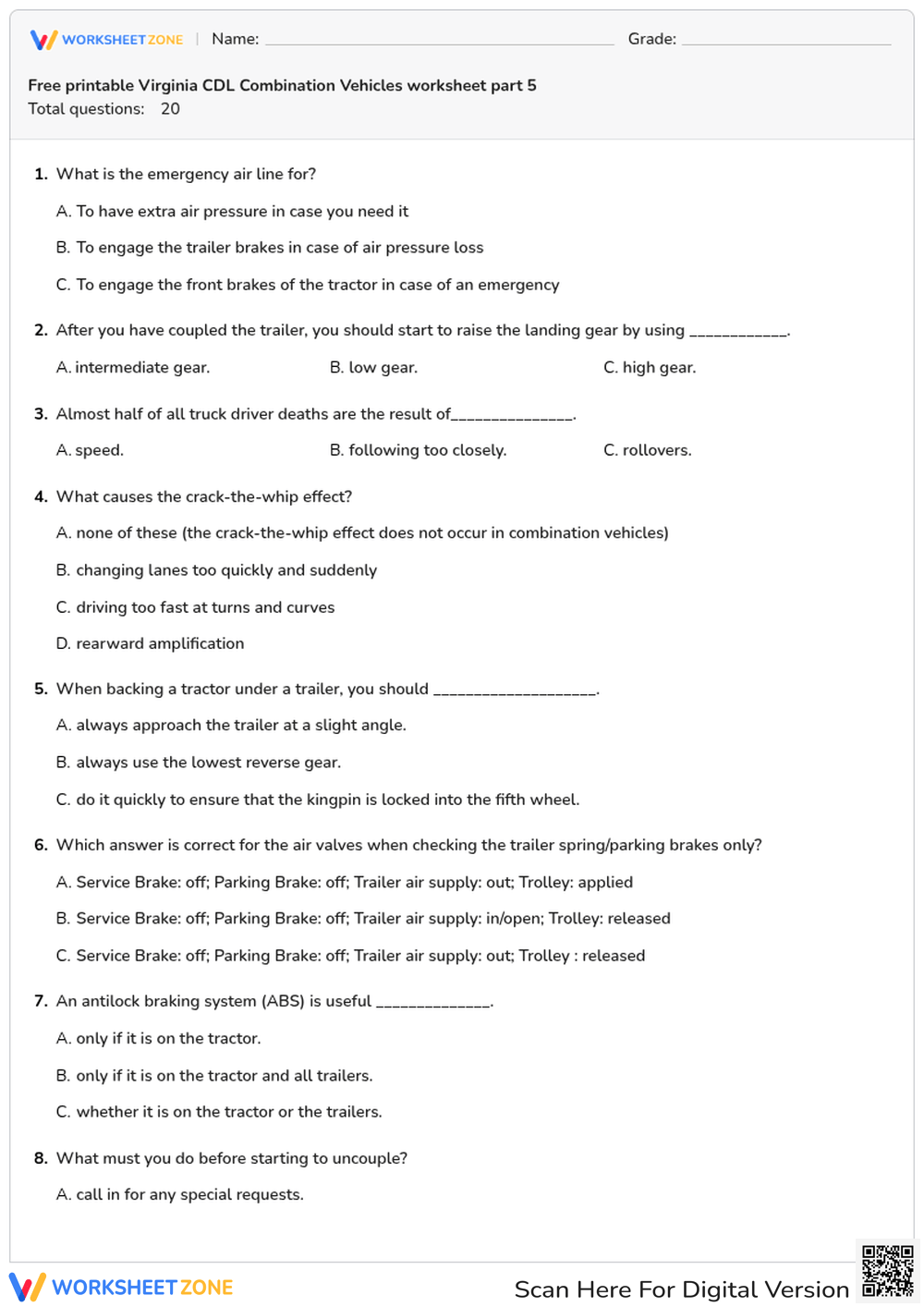 Our printable Virginia CDL Combination Vehicles worksheet will help you get 100% ready for your coming exam