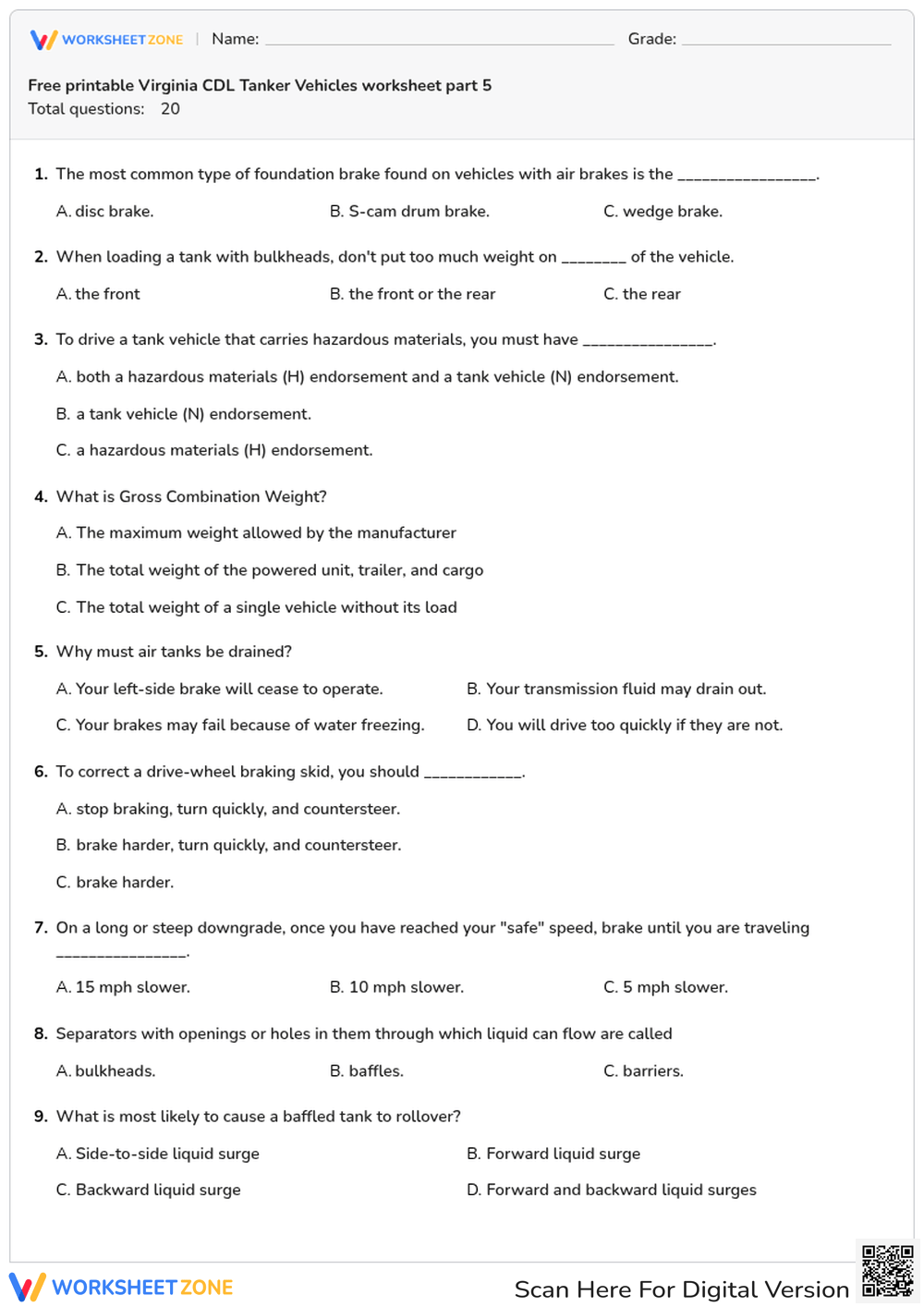 Our printable Virginia CDL Tanker Vehicles worksheet will help you get 100% ready for your coming exam