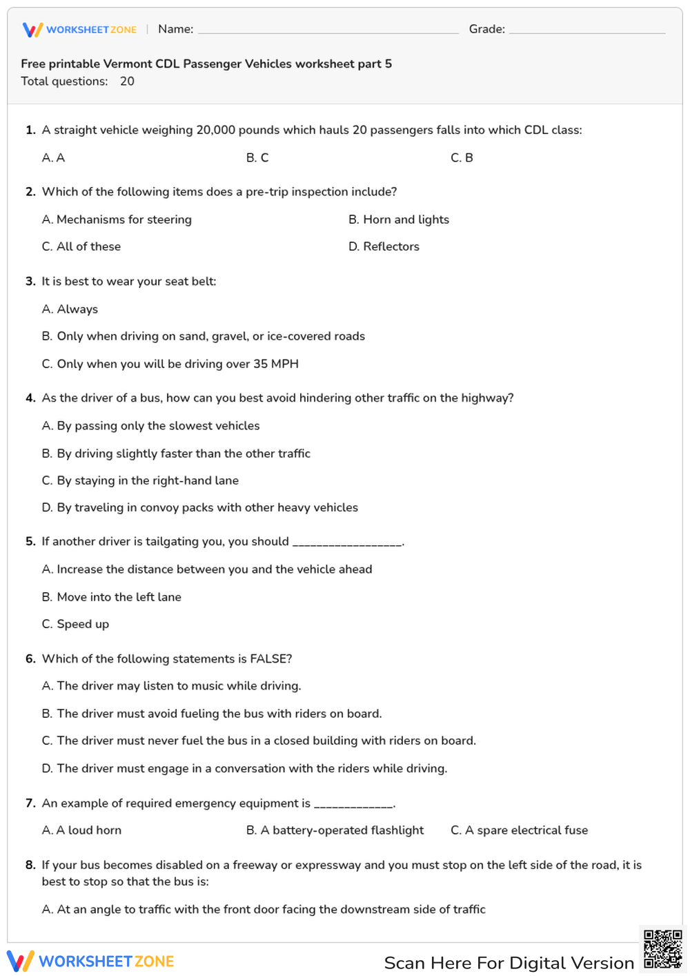 Our printable Vermont CDL Passenger Vehicles worksheet will help you get 100% ready for your coming exam