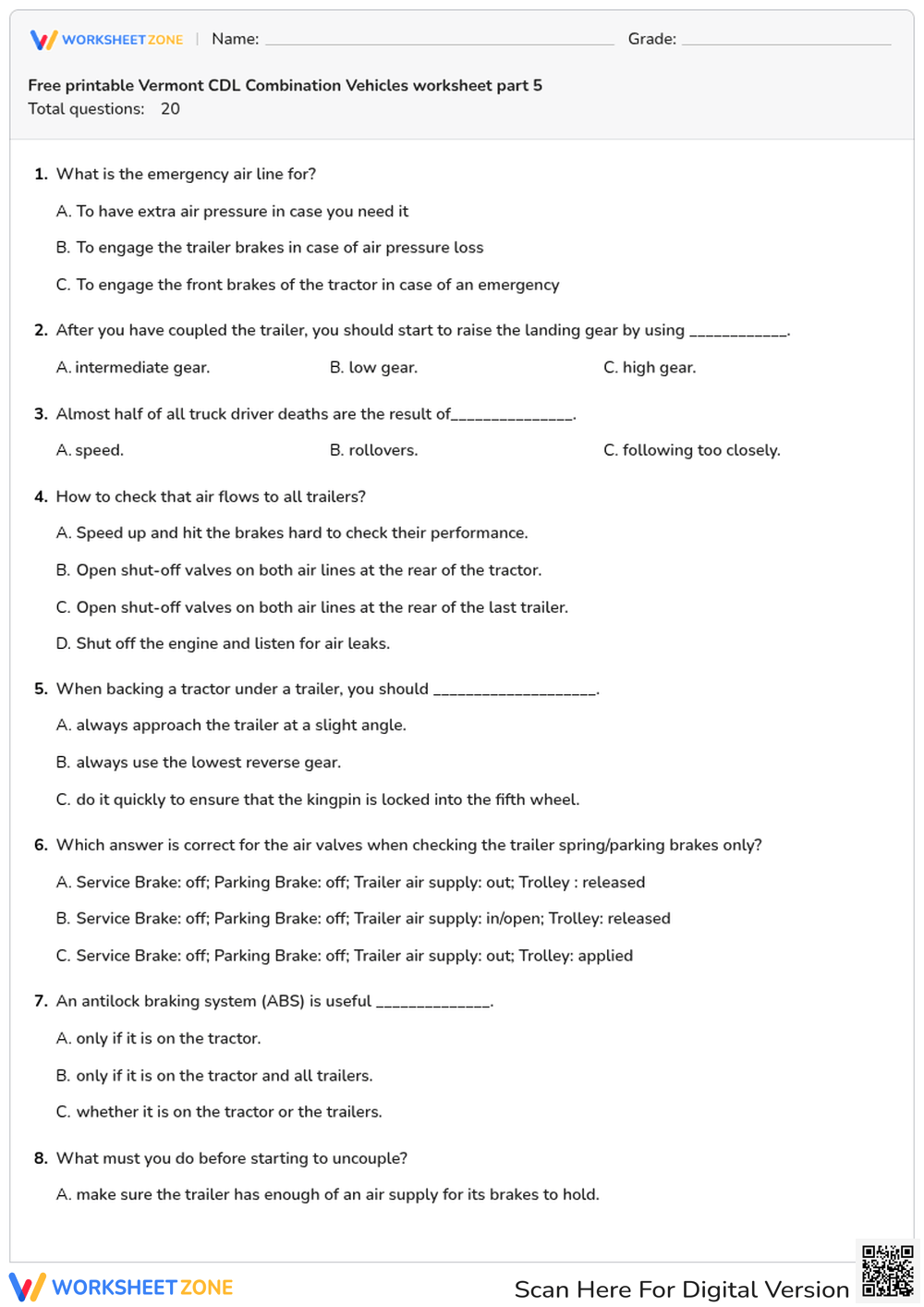 Our printable Vermont CDL Combination Vehicles worksheet will help you get 100% ready for your coming exam