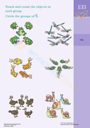 This worksheet requires children to count the number of different types of wetland animals and circle the groups that have five animals in them.