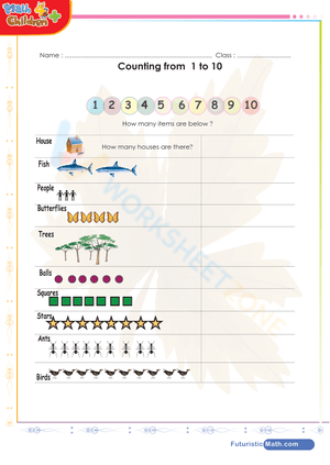 Practice counting objects from 1 to 10 with this free printable math worksheet.