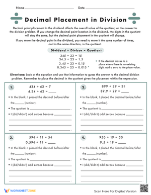 Learn decimal placement in division with our clear worksheet. Solve problems accurately and enhance your skills! Download the guide now.