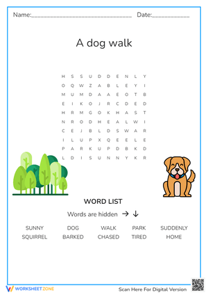 Find these words: SUNNY, DOG, WALK, PARK, SUDDENLY, SQUIRREL, BARKED, CHASED, TIRED, HOME