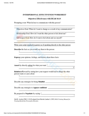 Learn to improve objective effectiveness with the DEAR MAN strategy. Communicate your needs effectively. Download this worksheet now!
