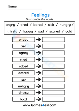 Help young learners practice emotional vocabulary with this fun worksheet! Unscramble words like happy, sad, angry, and more. Perfect for Grade 1 students.