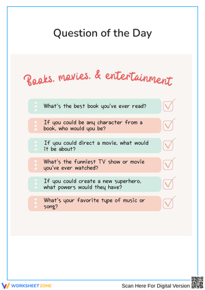 Creative "Question of the Day" prompts about books, movies, and entertainment to inspire students' imagination and spark fun discussions.