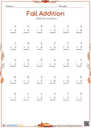 Fall into some fun addition practice with this seasonal worksheet! Children will solve 30 one digit problems as they practice addition facts within 10. Designed for first graders, this back-to-school worksheet is a great way to reinforce the basics of simple addition as learners prepare to add larger numbers.