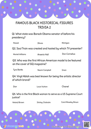 Test your knowledge of Black history! Learn about famous figures and their contributions. Download this engaging trivia worksheet today!