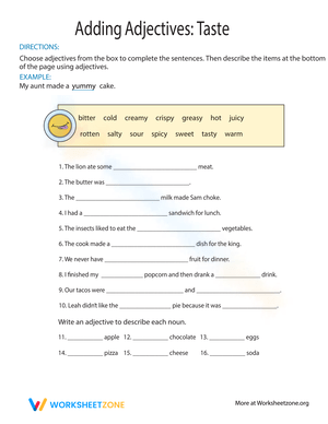 Learn about taste adjectives with this engaging worksheet! Enhance your descriptive writing skills. Start exploring taste adjectives today!