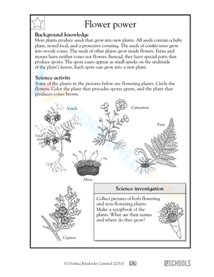 Which ones are flowering plants? In this coloring science worksheet, your child learns about plants that produce spores, cones, and flowers.