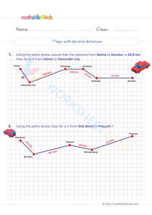 Practice finding distances using maps with decimals with this free printable math worksheet.