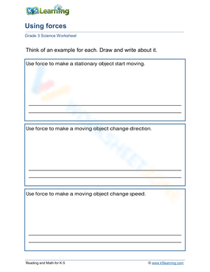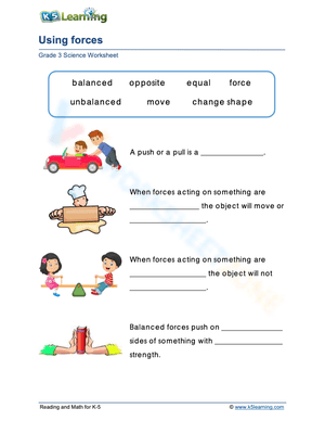 Fun worksheet on forces in action with push, pull, wind, water, gravity, and magnetism examples. Great for teaching elementary students about motion.