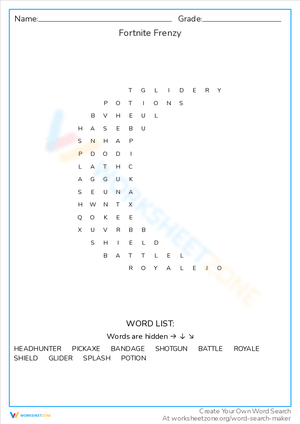 Experience Fortnite Frenzy! Find hidden terms related to the popular game with this exciting word search. Perfect for Fortnite fans of all ages!