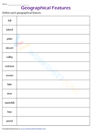 This defining each geographical feature vocabulary worksheet for 3rd grade and 4th grade children helps recapitulate the terminology and descriptions related to landforms and bodies of water.