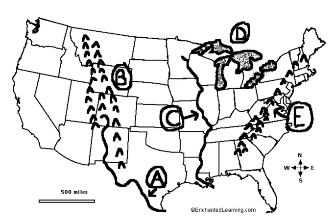 Which river starts in Colorado and flows into the Gulf of Mexico: Rio Grande River. The Prime Meridian is at ____________________: 0 degrees longitude. Which mountain range is in the western part of the United States: Rocky Mountains. Which mountain range is in the eastern part of the United States: Appalachian Mountains. What hemisphere is Asia in: NorthernHemisphere. What hemisphere is Australia in: Southern Hemisphere. What river is in New York and flows into the Atlantic Ocean: Hudson River. What river is near the Great Lakes: St. Lawrence. What mountain range is a part of Georgia's geography: Appalachian Mountains. What river borders Texas: Rio Grande River. What river flows through 6 states and then into the Mississippi: Ohio River. What line of latitude is Denver the CLOSEST to? Remember our saying for latitude. : 40 degrees N. What line of longitude is Fargo CLOSEST to? Remember what longitude lines are! : 100 degrees W. What city is closest to 42 degrees N and 71 degrees W: Boston. What river is letter E: St. Lawrence River. What river is letter D: Ohio River. What river is letter A: Colorado River. What mountain range is letter A: Rocky Mountains. What mountain range is letter B: Appalachian Mountains. What are the cardinal directions on a compass: North, East, South, West