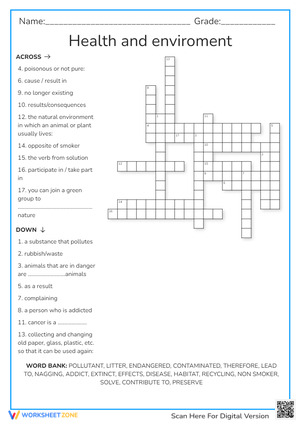 Complete the "Health and environment crossword worksheet" by using the given hints and wordbank