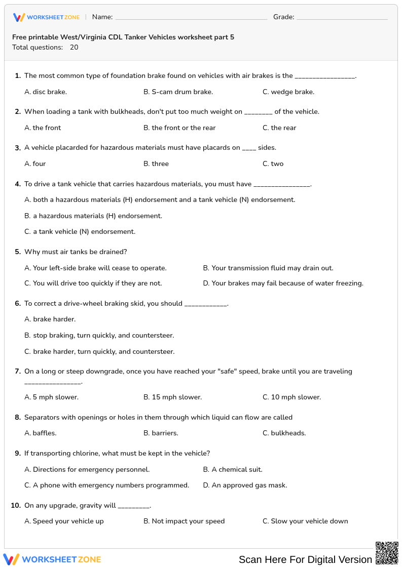 Our printable West/Virginia CDL Tanker Vehicles worksheet will help you get 100% ready for your coming exam