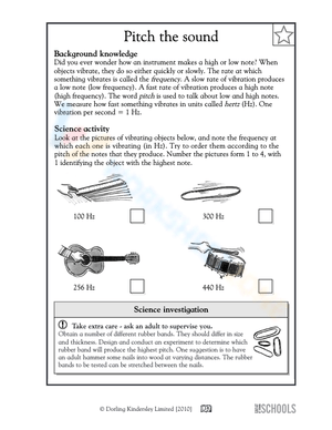 A slow rate of vibration produces a low frequency, which makes the sound of a low musical note. In this science worksheet, your child learns to relate frequency and pitch.