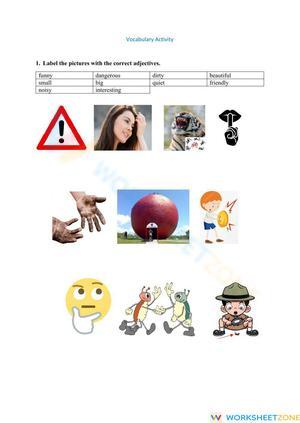 Enhance vocabulary skills with this fun adjective worksheet! Kids label pictures using adjectives like big, small, dangerous, beautiful, and more.