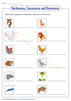 Illustrated in this printable worksheet are pictures of animals. Keeping in mind their food habits classify the plant-eaters as herbivores, meat-eaters as carnivores and those that survive on both as omnivores.