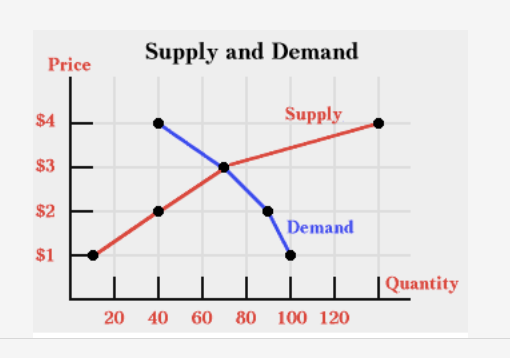 This part of the market determines DEMAND: buyers. This part of the market determines SUPPLY: sellers. For the law of demand, as price rises, what happens to quantity demanded: it goes down. For the law of supply, as price rises, what happens to quantity supplied: it goes up. When quantity supplied and quantity demanded is equal: equilibrium. If a price is above equilibrium price, it creates a..: surplus. If a price is below the equilibrium price it creates a..: shortage. What does this curve represent: supply. What could cause the shift from D1 to D2: A change in preferences. This graph represents...: Changes in demand. The point in the middle of the two curves represents or shows....: Market Equilibrium. Cold weather in Florida has damaged this year’s orange crop. Farmers have only half of the usual amount of oranges to sell. What will happen to the price of oranges: The price will go up.. Farmers in California have had wonderful weather. They have produced the largest crop of watermelons in years. What will happen to the price of watermelons: The price will go down.. New technology advances the rate at which furniture can be assembled. Why does this change the supply: There is a change in cost of production.. Which statement expresses a central idea of how the laws of supply and demand work: Prices are determined by the interaction of producers and consumers.. When companies compete in a market economy, what is usually the result: Consumers are able to buy goods for the best available price.. If the price of a substitute to good X increases, then: The demand for good Y will increase. . If the demand for X decreases, then the demand for the complementary good Y will..: Decrease. When the supply of a product or service goes up and the demand stays the same the Price will typically do what? : fall. Mr. Sherman goes to the ticket booth to buy tickets for a Lakers game. Mr. Sherman is told that the game is sold out and no tickets are available. Which best explains why there are no basketball tickets available? : The demand for tickets was greater than the supply.. When a price ceiling is in place keeping the price below the market price, what’s larger: quantity demanded or quantity supplied: Quantity demanded. What is the equilibrium quantity in this graph: 600. If the government set the price at $700, would that be a price ceiling or floor: Price Floor . Change in quantity demanded due to a change in price that alters a consumers real income : income effect . In Jim's household, everyone consumes and enjoys milk. Recently, the price on milk increased by two dollars, but despite this increase, Jim and his family still continue to buy the same amount of milk, for they consider it a necessity. Jim's family's demand for milk would be considered fairly: inelastic. When the price on Dasani bottle water decreased, Brad quit buying Nestle bottled water and switched over to Dasani. Brad's demand for Nestle water is fairly: elastic