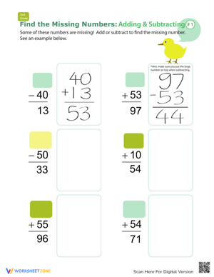 This worksheet helps kids understand addition and subtraction in a different way. One of the numbers is missing in each problem. Using the answer and the other number, kids reverse the operations—changing addition to subtraction and subtraction to addition—to find the missing number.For more reverse addition and subtraction, check out the rest of the worksheets in the Find the Missing Numbers series.